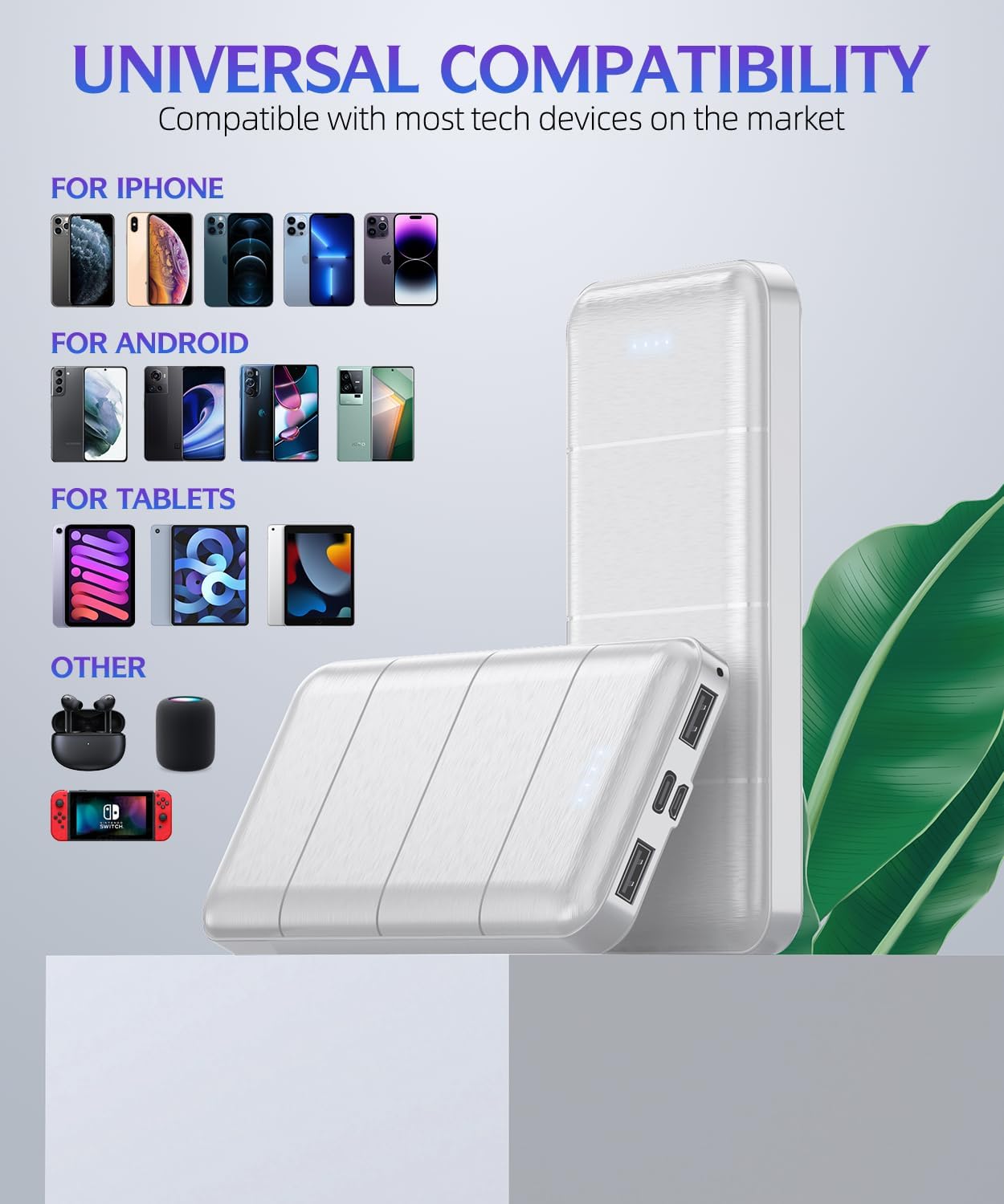 Portable charger Features an intelligent controlling IC, can automatically identify and provide universal compatibility with all devices. It intelligently adjusts the current and voltage to suit each device, effectively preventing overcharging, overvoltage, overcurrent, and short circuits. This ensures a safe and stable charging experience, say hello to worry-free charging.