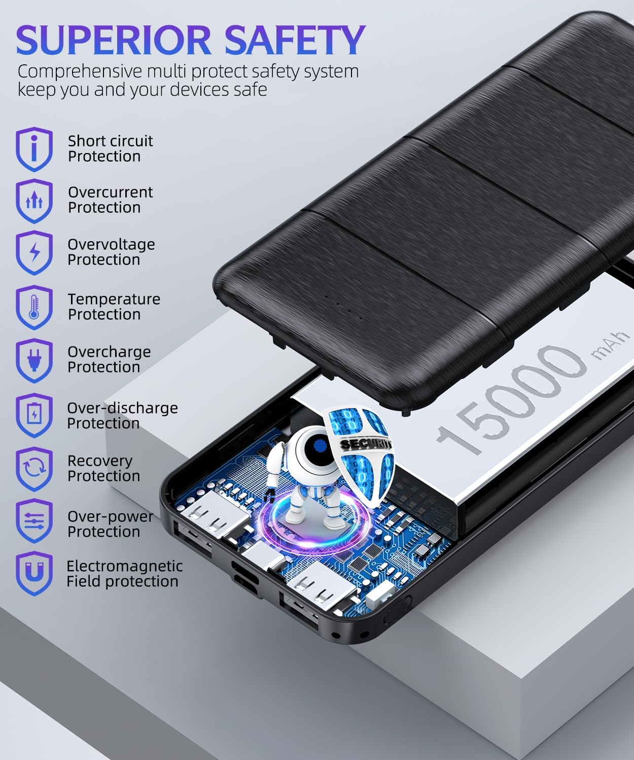 Power bank utilizes a safe high-density lithium polymer battery module because safety is our utmost priority. Not only is it more compact, but it also offers a larger battery capacity, surpassing traditional lithium-ion batteries in safety standards. Your satisfaction and safety are our primary concerns, ensuring a positive shopping experience for you.