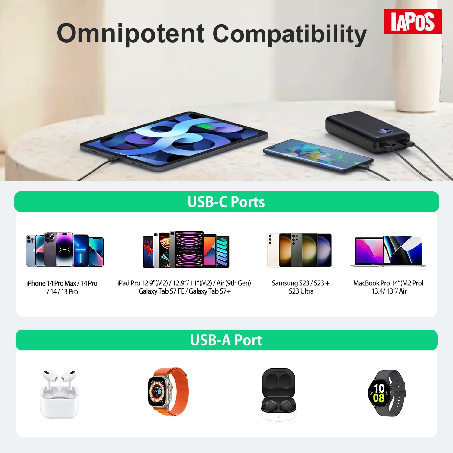 [Triple-Port & Omnipotent Compatibility]: IAPOS battery pack portable charger comes with 2 USB-A (22.5W output) ports and 1 USB-C (18W input/22W output) port, allowing for simultaneous charging of up to three devices. IAPOS portable battery charger widely compatible with iPhone 15/15 Plus/15 Pro/15 Pro Max/iPhone14/13/12/11/Samsung Galaxy/Google Pixel and more Android phones/tablet and other electronic devices.