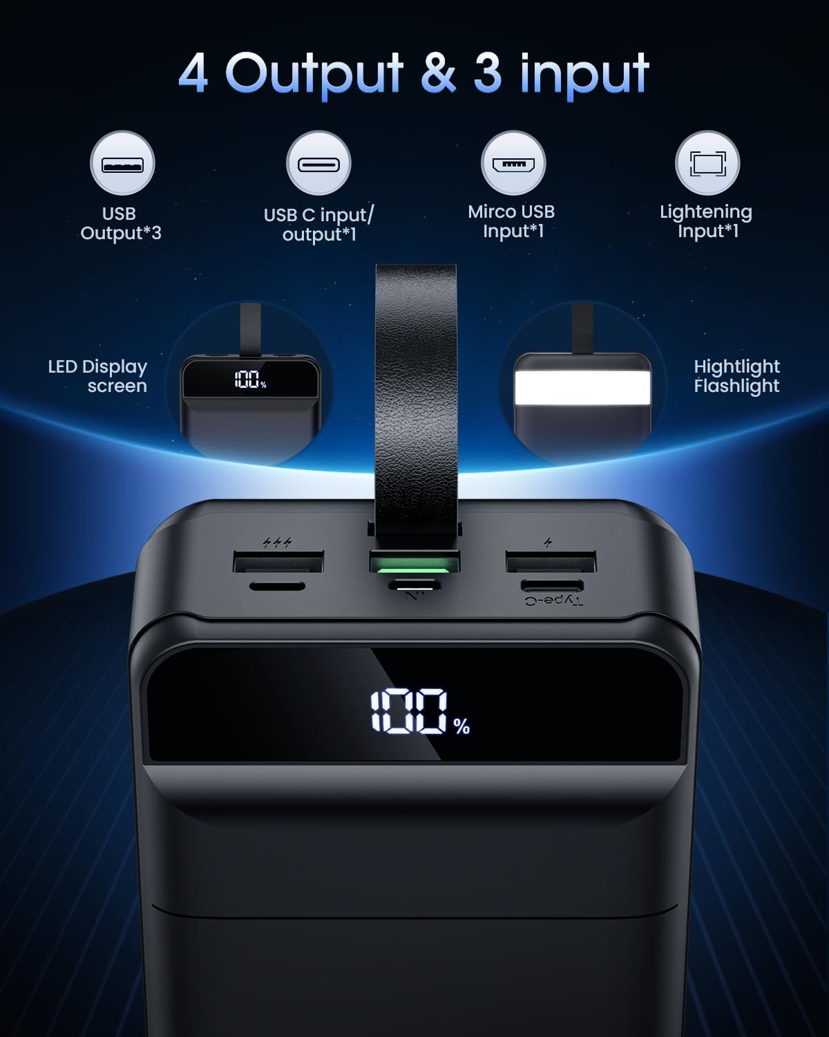 Digital Display and Flashlight:60000mAh power bank with LED digital display show exact percentage of the remaining power of the portable battery bank and the battery pack also equipped with flashlight. It is travel or hurricane essential for camping etc