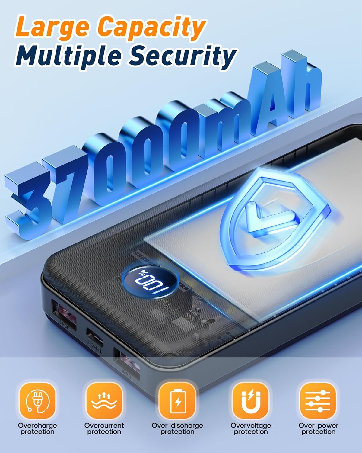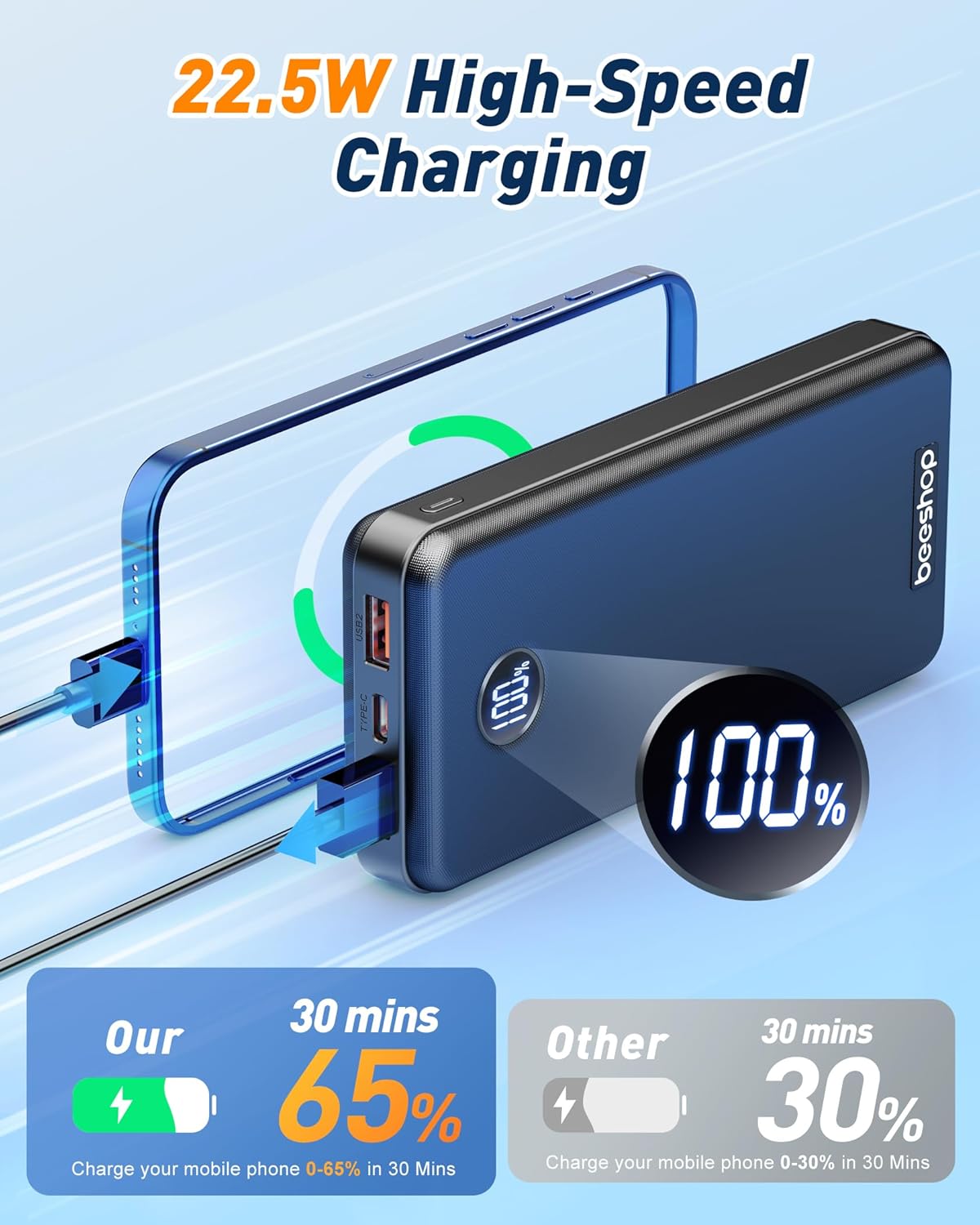 【37,000mAh Huge Capacity & Compact Design】BEESHOP use the new high-density polymer battery, it has a larger capacity under the same volume. Our 37000mAh portable charger is 5.99×2.76×0.9in, and weighs 12.28oz, close to the size of the iPhone 16, The super compact and portable design allows you to easily place it in your backpack, handbag, or pocket. Ideal for those who travel or going out need quick and reliable charging.