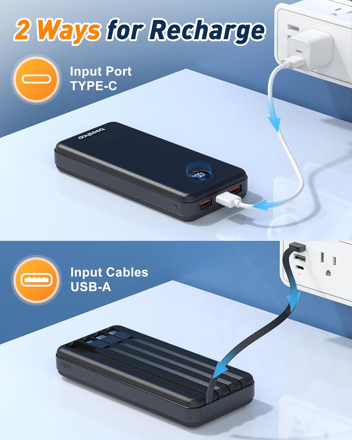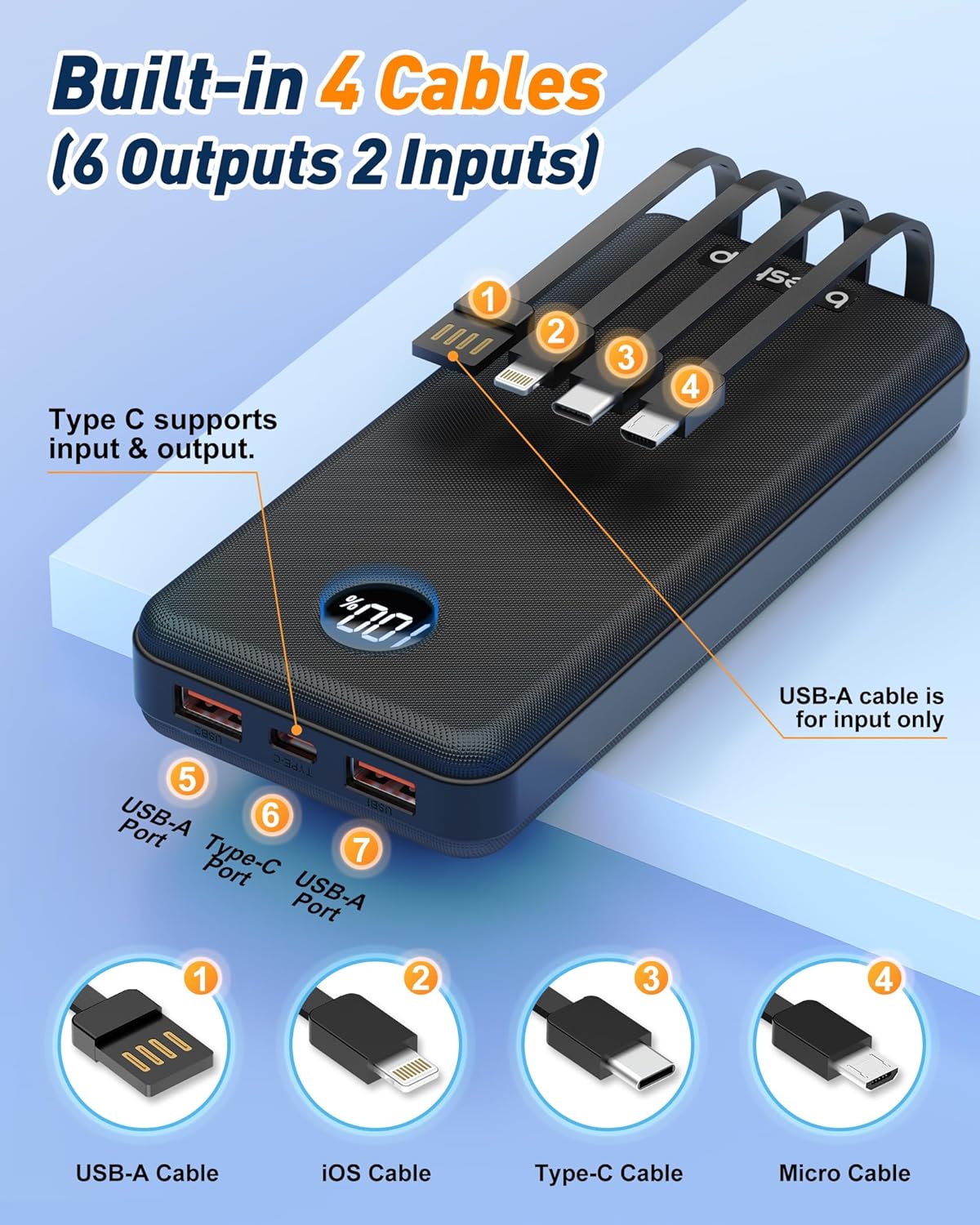【Efficiently Charge 6 Devices Simultaneously】Total 6 output ports & 2 input ports(built-in 4 cabls(Micro、iOS、Type C、USB A), USB 1 port, USB 2 port, Type C port ), support max 22.5W charging for 6 smart devices simultaneously. The Upgrade Type C interface serves as both input and output, perfectly fit your new iPhone, iPad and all upcoming USB C devices. No longer need to carry a variety of cables on the road, say goodbye to the trouble of messy charging cables!