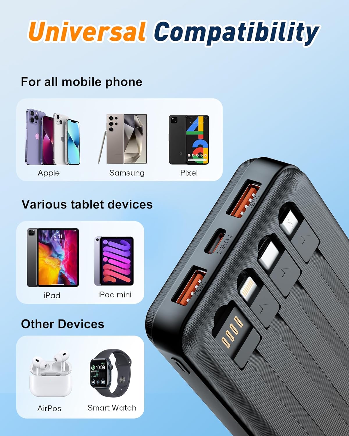 【Universal Widely Compatibility Power Bank】Compatible with almost all types smart devices on market such as Samsung S24, S23, S22, S21, S20, A52, A32, Z flip, Z fold series, iPhone 16 15 14 13 12 11 Series, XR, XS Max,and Google Pixel series, and other Android phones, iPad, headphones, smartwatches, etc