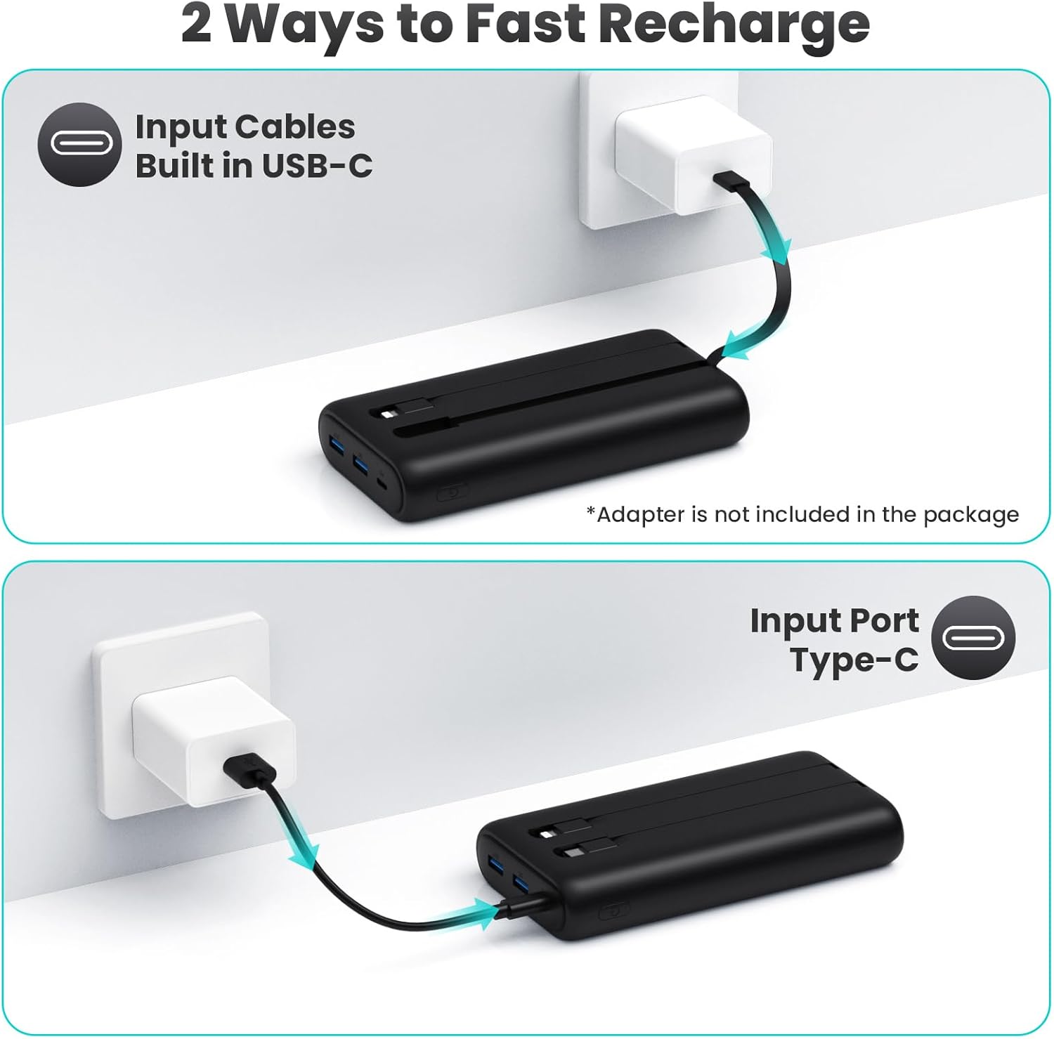–2 Inputs to recharge the power bank with cables