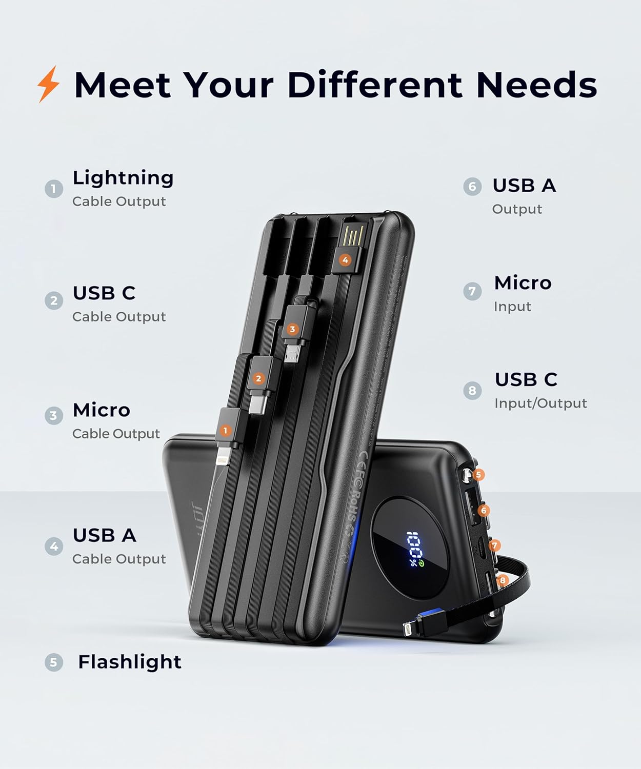 【Built-in Cables for Ultimate Convenience】Our portable charger includes 4 cables (Lightning, Type-C, Micro, USB-A), 3 ports, and 2 flashlights. These cables are durable, withstanding over 10,000 bends. Compatible with nearly all electronics including iPhone 16 Models/iPhone 14 Plus/iPhone 12 Mini/Samsung Galaxy/Google Pixel/Motorola/Android Cell Phone/Flip Phone/Tablet/Apple Pencil/Small Fan and more multiple devices
