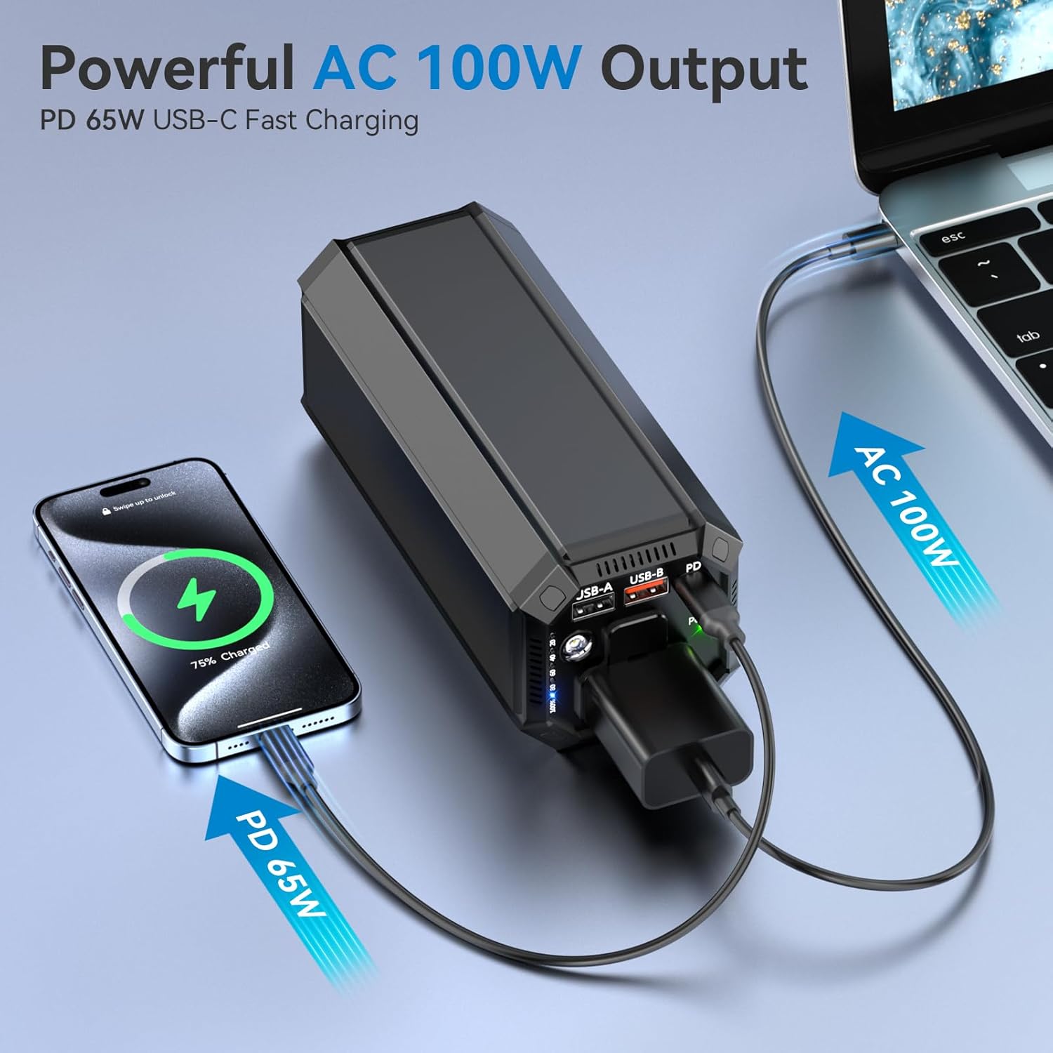 Huge 27000mAh Capacity: This power bank has a capacity of 27000mAh and four output ports for your emergency needs. There’s a 100W AC port, a 65W PD Type-C port, a 12W USB port, and an 18W USB port for all your charging needs. You can charge your laptop, phone, tablet, camera, etc.