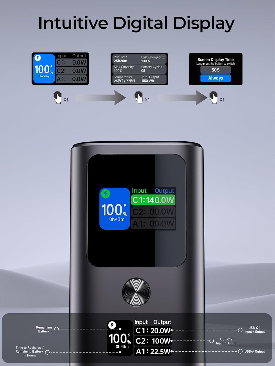 Intuitive Smart Digital Display: Keep track of your power bank’s status effortlessly with the easy-to-read LCD digital display. It shows the output and input power levels, as well as the estimated time for a full recharge.
