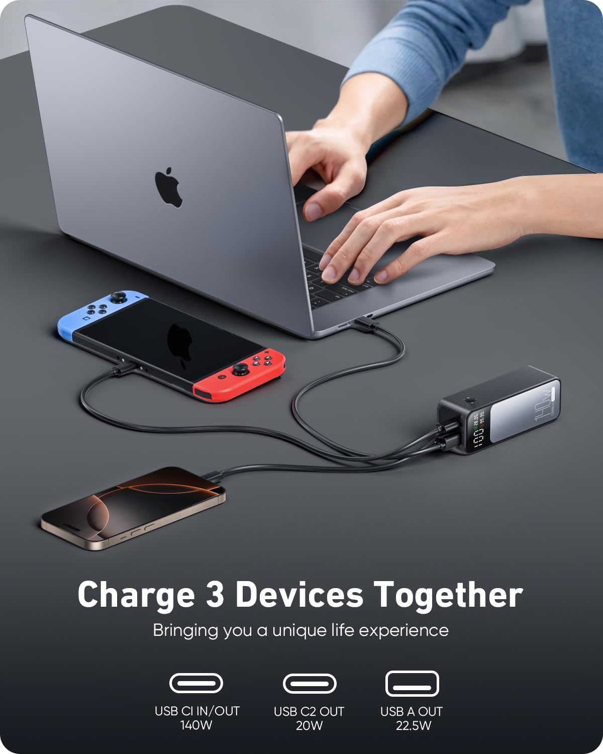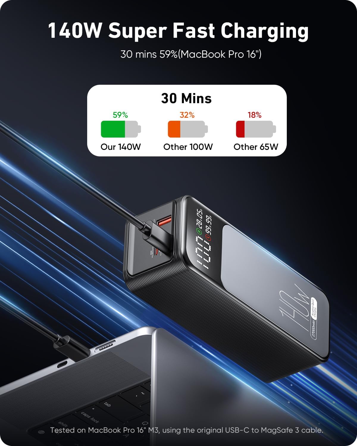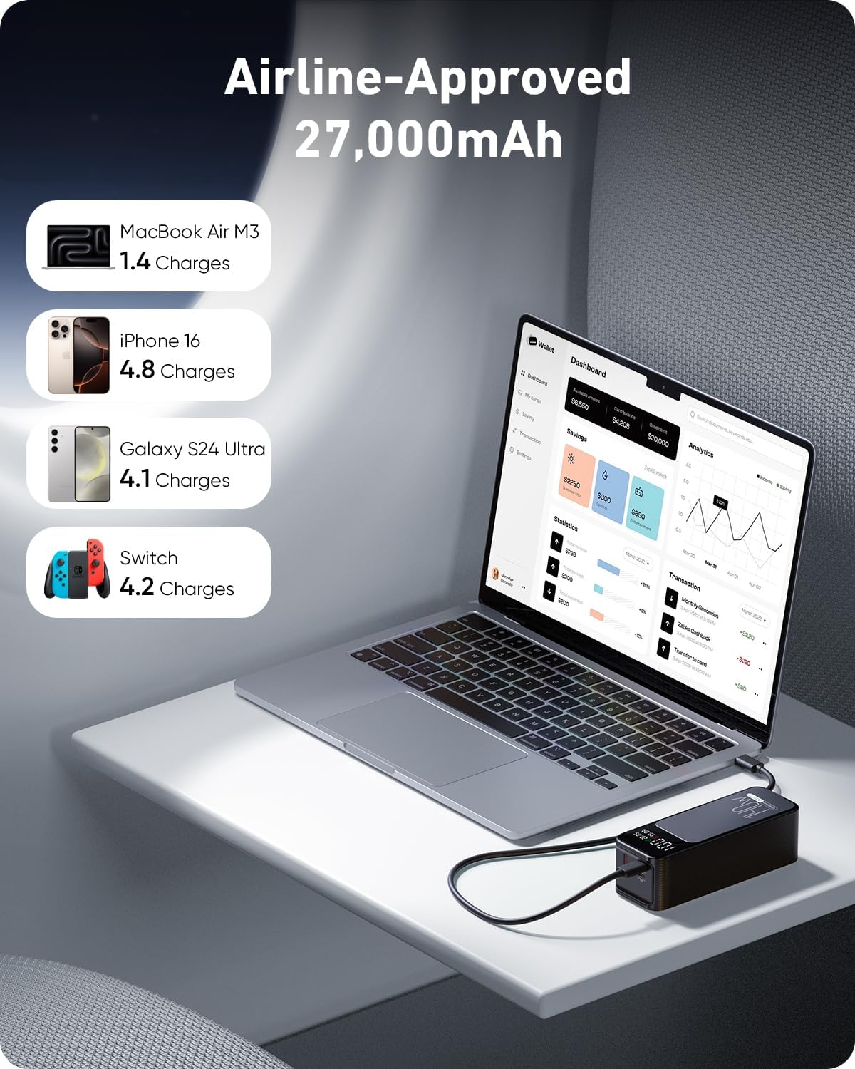 High-Capacity Power for All Devices: With a 27,000mAh capacity, this laptop power bank can recharge MacBook Air M3 up to 1.4 times or iphone 16 up to 4.8 times. Power through your day, ensuring your devices stay powered during long trips or heavy usage.