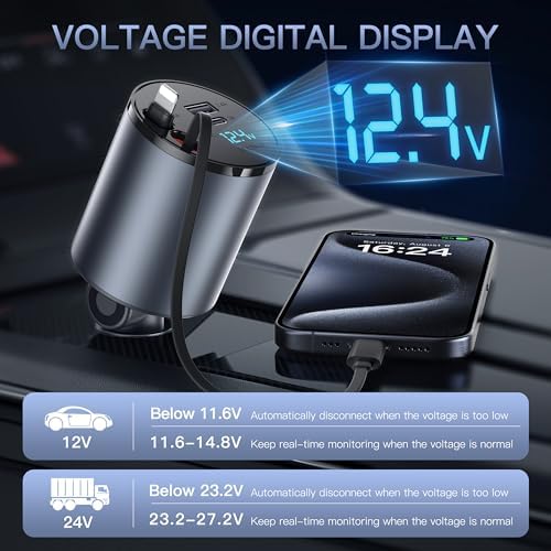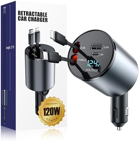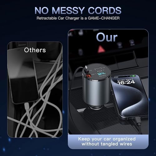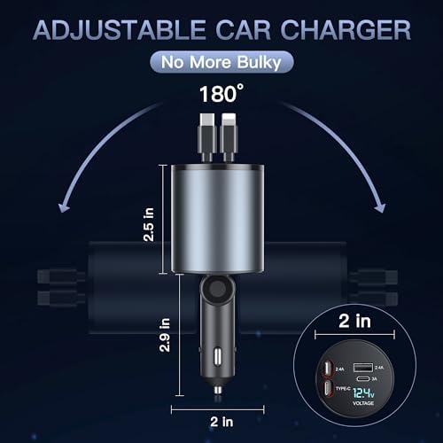 ðãRetractable Charging CablesãOur car charger has 2 retractable charging cables, Type-C and lighting cables, with a freely retractable length of 2.7 feet. You could have fast charging in the back seat,Keep your car tidy.