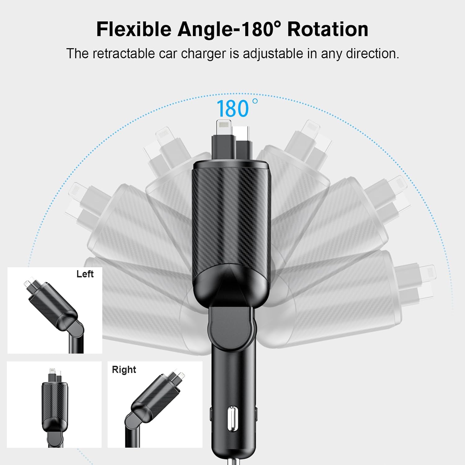 【180°Flexible Angle】The newly designed retractable car charger get flexible charging angles with the 180° bend-over feature that allows you to charge your devices from any angle.