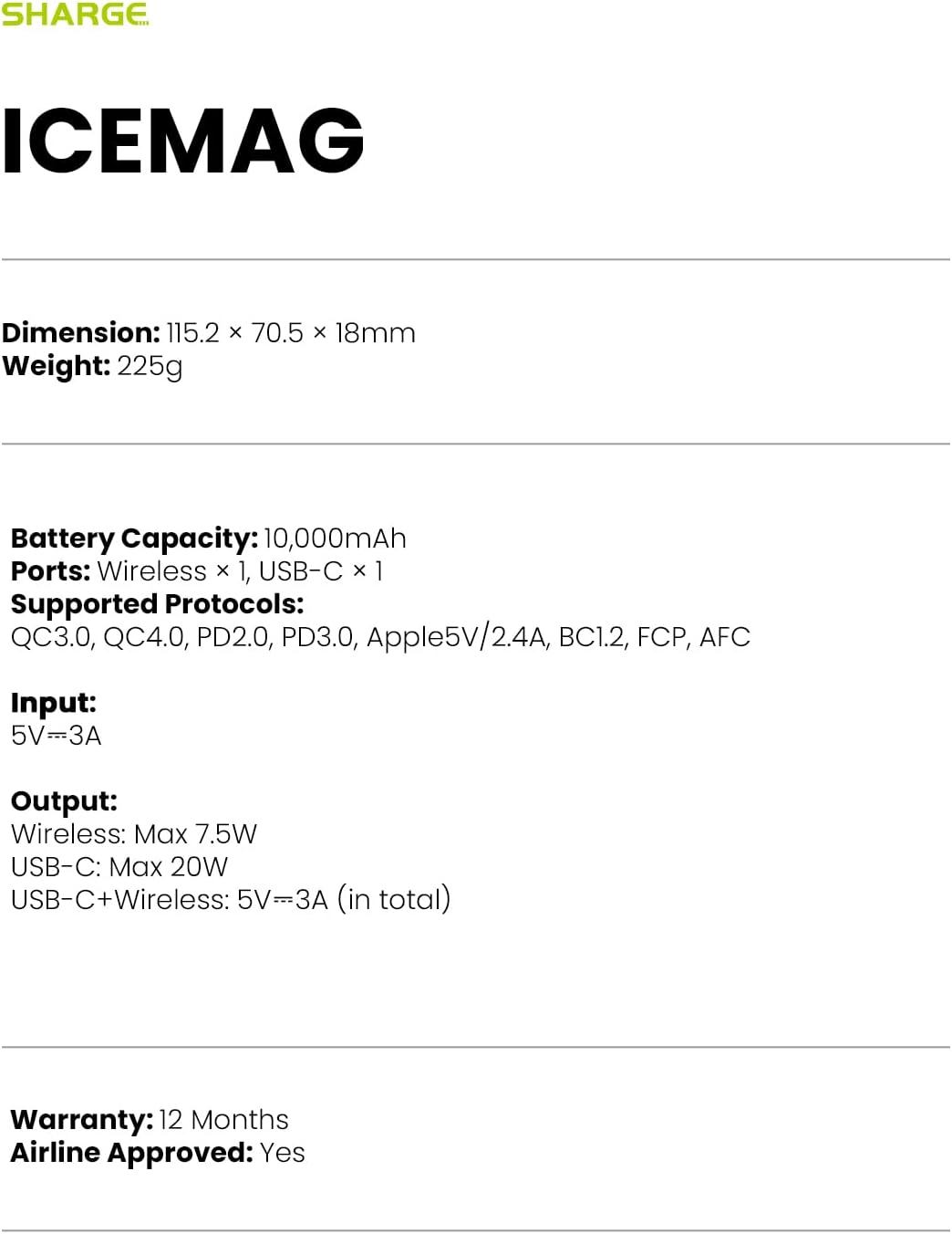 What You Get: icemag power bank, USB C cable (length: 7.9”) and user guide