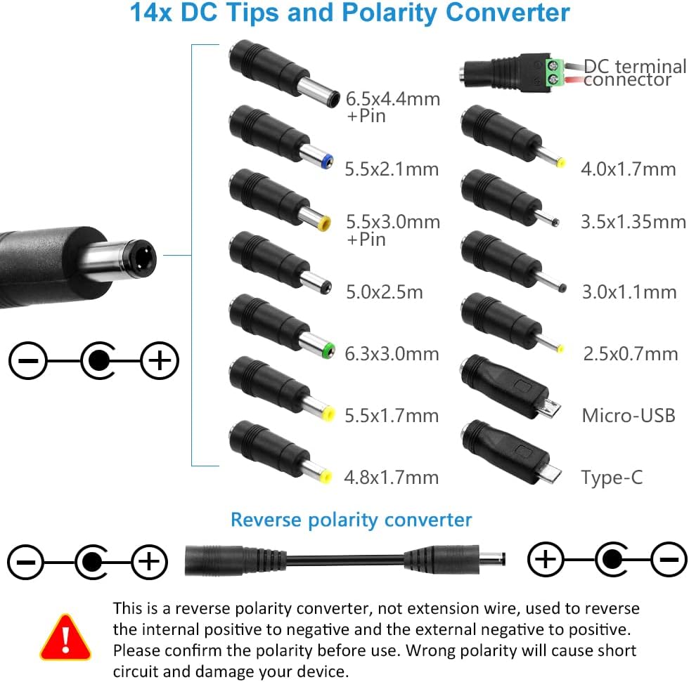 It comes with an original 5.5×2.5mm tip (inside”+”, outside”-“) and 14pcs frequently used tips: 6.5×4.4mm+Pin, 5.5×2.1mm, 5.5×3.0mm+Pin, 5.0×2.5mm, 6.3×3.0mm, 5.5×1.7mm, 4.8×1.7mm, 4.0×1.7mm, 3.5×1.35mm, 3.0×1.1mm, 2.5×0.7mm, Micro-USB, Type-C and DC terminal connector. We especially add a reverse polarity converter, which will double its application scope.
