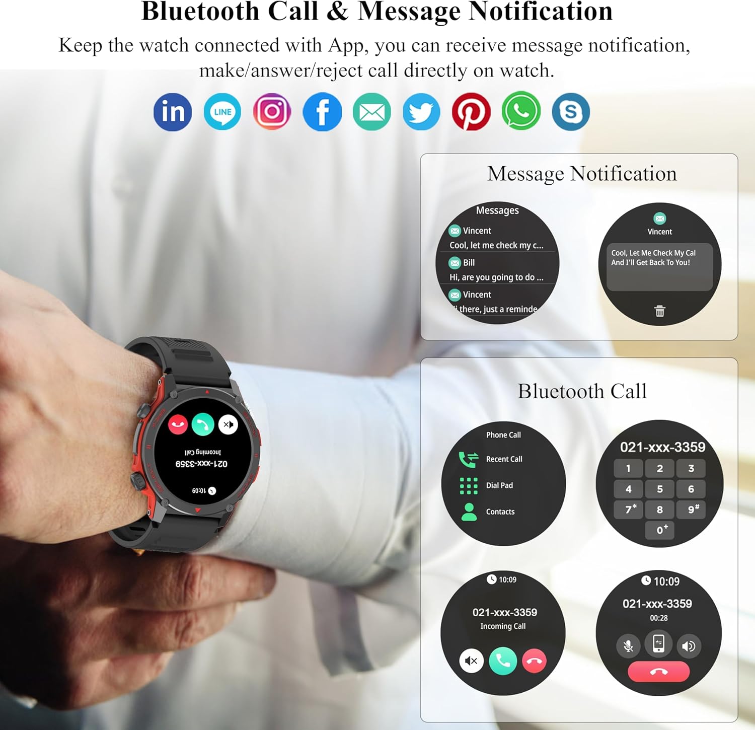 Stay Connected with APP: This fitness watch with call function, equipped with advanced new-chip technology, allows you to make and answer calls seamlessly on your wrist, with the freedom to reject unwanted ones. It provides message notifications and customizable vibration modes. Beyond communication, it offers access to weather forecasts, a global world clock, cycle tracking, and alarm clock functions. Versatile features include timers, stopwatch, remote camera control, and music playback.