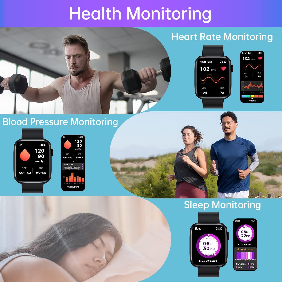 【7/24 Health Monitoring and Multi-function】: smart watch with heart rate blood pressure blood oxygen sleep monitoring, always pay attention to your health status. The multi-function smart watch also has music playback, sedentary reminder, drinking water reminder, flashlight, game, calculator, find mobile phone, weather forecast, remote control photo, alarm clock, 8 menu styles, stopwatch, etc. to help you Improve the quality of life.