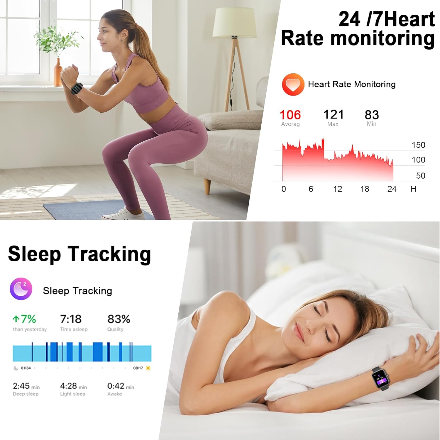 24/7 Heart Rate Monitor and Sleep Tracker Monitor: The smart watches for women has a built-in high-performance sensor that can record our heart rate changes in real time. Monitor your heart rate 24 hours a day and keep an eye on your health. But the data is just used for reference. This fitness watch can also measure your sleep automatically, which helps you know awake, light, and deep sleep data and remind you to adjust your sleep habits and make informed decisions for a healthier lifestyle.