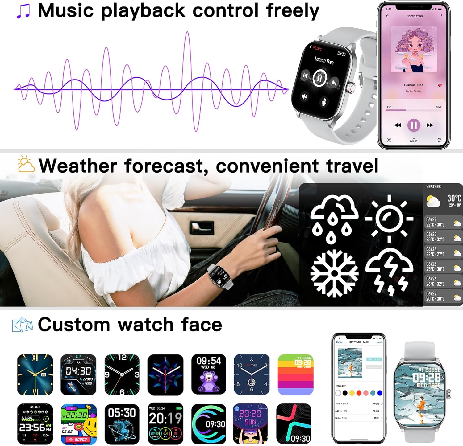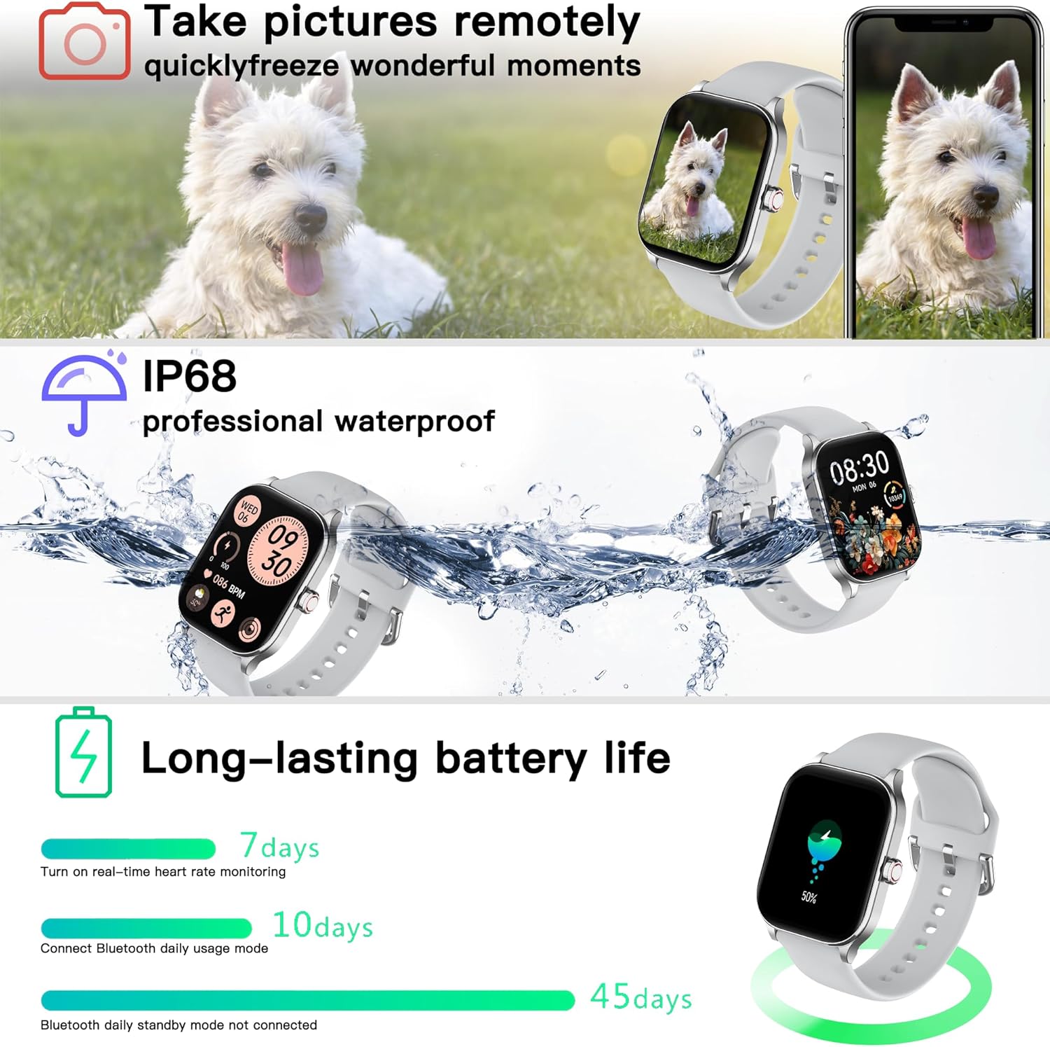 IP68 Waterproof and Additional Features:The smart wacth has multiple functions such as timer, stopwatch, alarm clock, sedentary reminder, music control, weather forecast, brightness adjustment, photo control, calculator, etc. Besides, IP68 water and dust resistant rating, the sport watch can beused even when washing hands and in the rain.