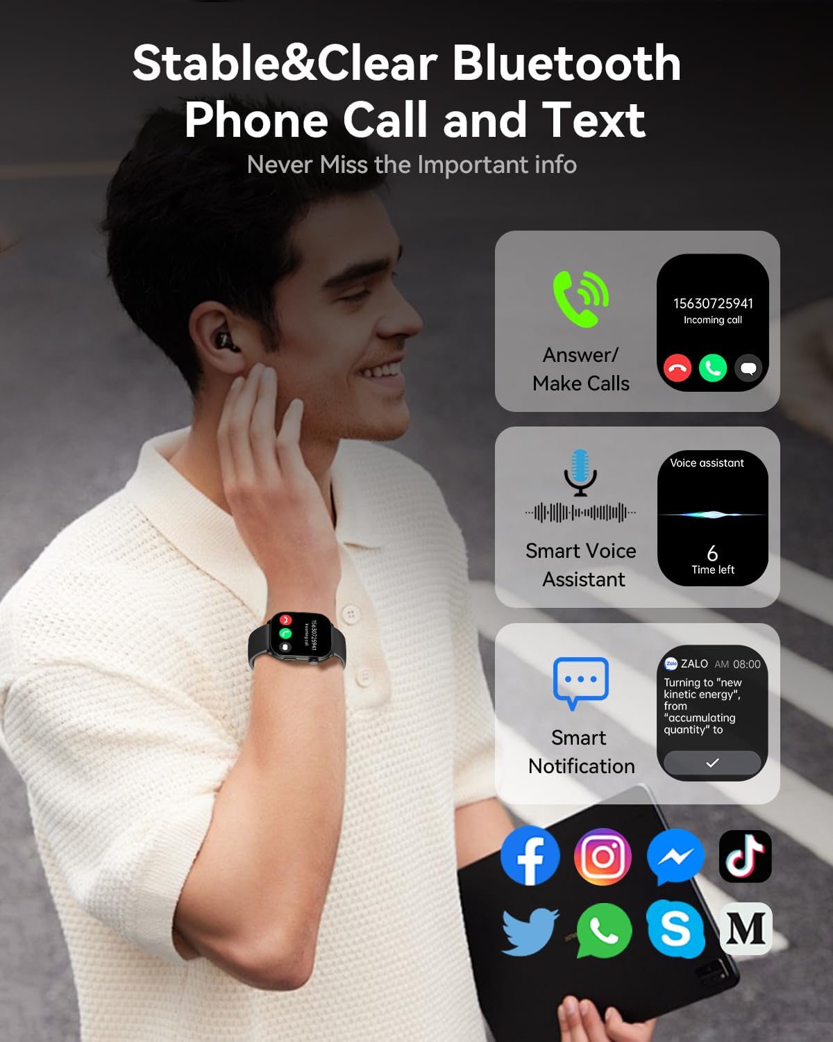 【Bluetooth Call & Smart Notifications】Make and receive calls with high-quality audio using the Bluetooth feature on your smartwatch. Stay informed with alerts from Facebook, WhatsApp, Instagram, Twitter, TikTok, Messenger, and more. Use voice commands with the built-in assistant for music control, weather checks, alarms, and more.