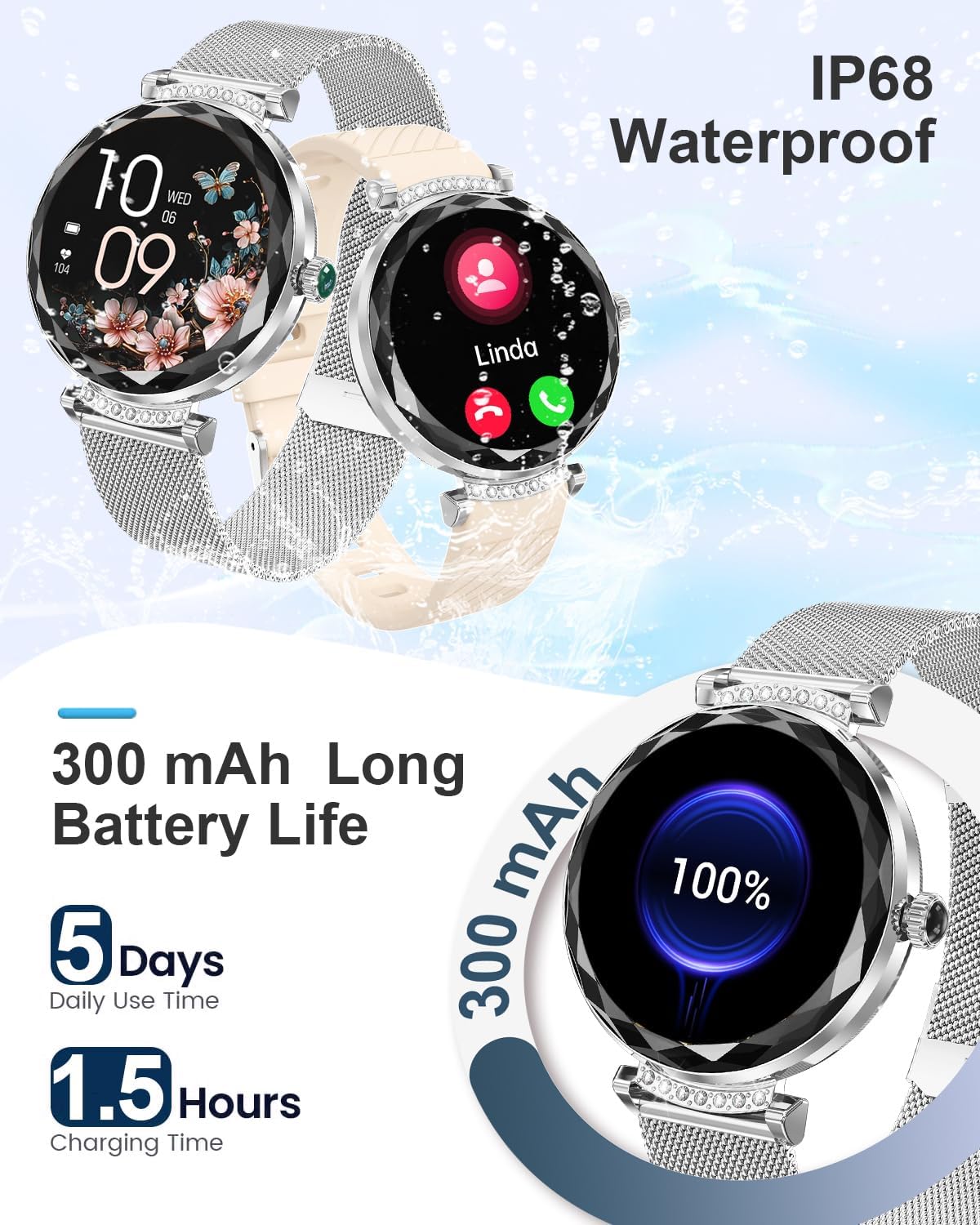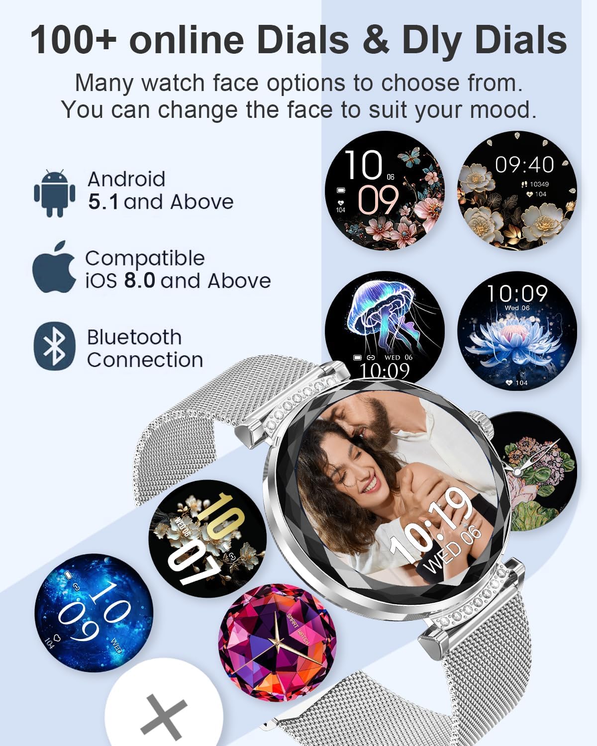 Always Stay Connected – the women’s smartwatch with phone function is equipped with Bluetooth technology 5.2, supports the storage of 50+ contacts and makes your communication more convenient. The built-in speaker and microphone ensure clearer calls. The message reminder function ensures that you do not miss any important information. Besides, an AI voice assistant makes your life smarter and more convenient. Compatible with Android 5.1+ and iOS 8.0+.