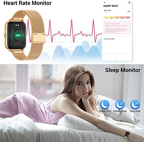 【Stylish Smart Watches for Women and Men】Waterproof Smart watch has a handsome design,with its square display and full touch 1.4 inch colorful screen,which has 240*240 pixels resolution make screen clear and bright.The case of bluetooth smart watch is made of metal. The display screen will be lightened up automatically while lifting the wrist.Digital watch has many face, you can even set your own photo as the face skins freely.Smart watch has a gold strap and an extra silicone pink strap