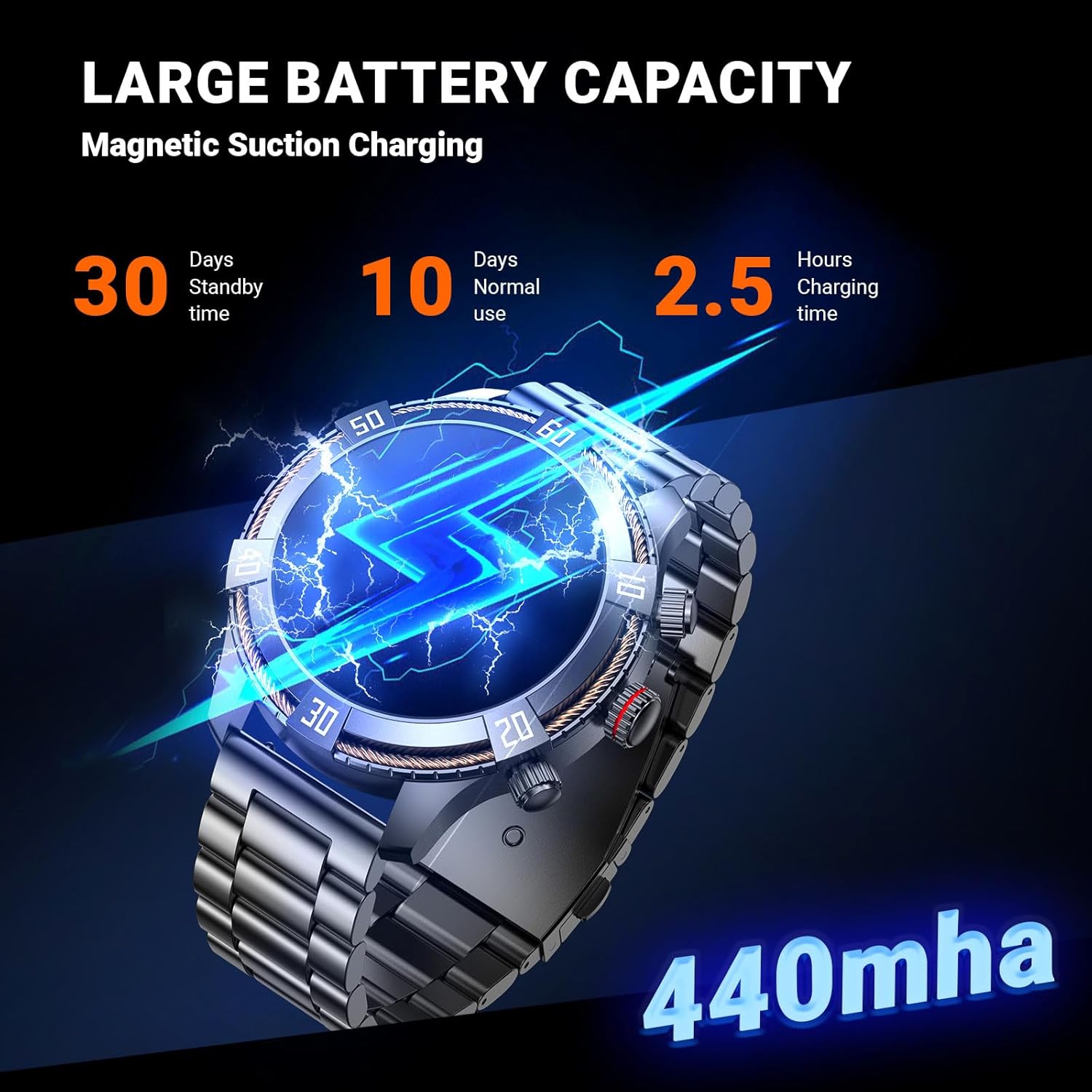 Smart Watch for iOS Android Compatible: Has a 440mAh battery for 7 – 10 days of normal use and 30 days standby. Supports iOS 10.0 and above, Android 5.0 and above
