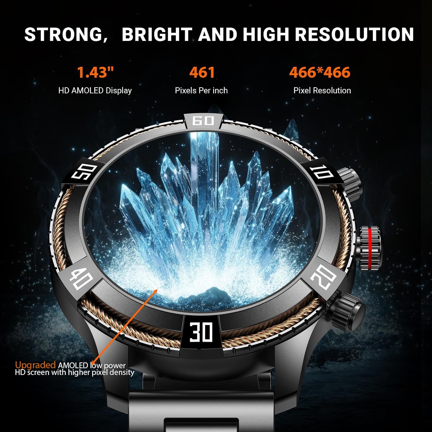 Smart Watches for Men Easy to Use: Featuring a 1.43″ AMOLED colour screen with a resolution of 466*466, it offers vivid and clear visuals. The rotating crown button allows effortless switching between dials and functions. Just flick your wrist to wake up the screen and instantly view social software messages