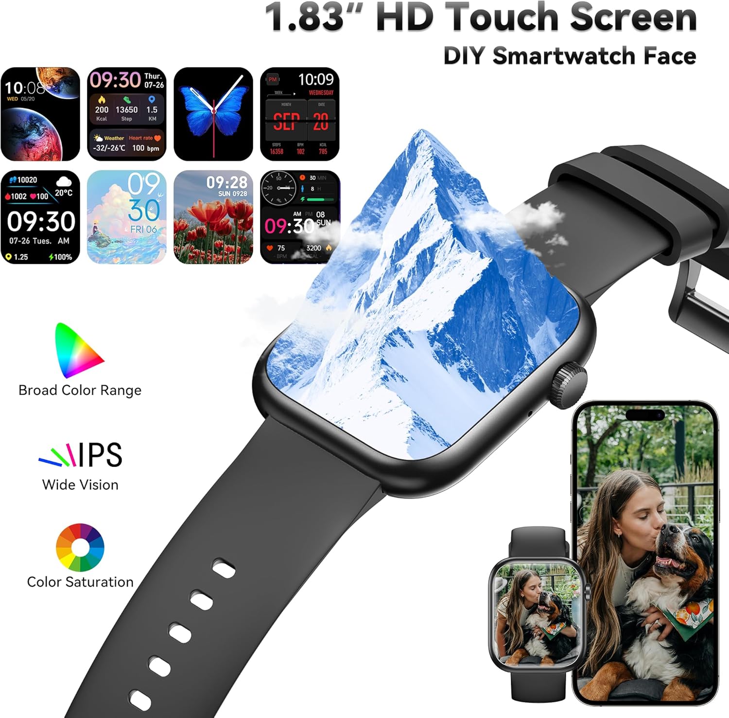 💫Personalized Watch Face & HD Display: This smart watch is equipped with a 1.83-inch ultra-large touch screen with clear picture quality and rich colors, bringing you a better visual experience. There are hundreds of watch faces of different styles to choose from on the mobile phone software “Da Fit”, in addition, you can also upload your favorite photos for customization.