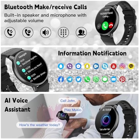 Bluetooth Call & Smart Notification: The smartwatch is equipped with a microphone and speaker, and supports making/answering calls after connected to Bluetooth. You can view call records and set up common contacts. It will remind you when your phone receives a text message. (such as WhatsApp, Facebook, Twitter, Instagram, Skype, Line, etc.). You can also use the AI voice assistant to view the weather, play music, send messages, and more.