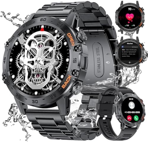 ⌚[Rugged Military Smartwatch] This smartwatch is made of high-quality metal case and the outer ring of the watch dial is reinforced with four screws, which is resistant to drops, pressure, water and dust. The screen is made of tempered glass with a Mohs hardness of 7H, which is hard, scratch-resistant and wear-resistant, while the outer ring is raised to further prevent the screen from being scratched. The smartwatch has passed several durability tests and works well even under harsh conditions.