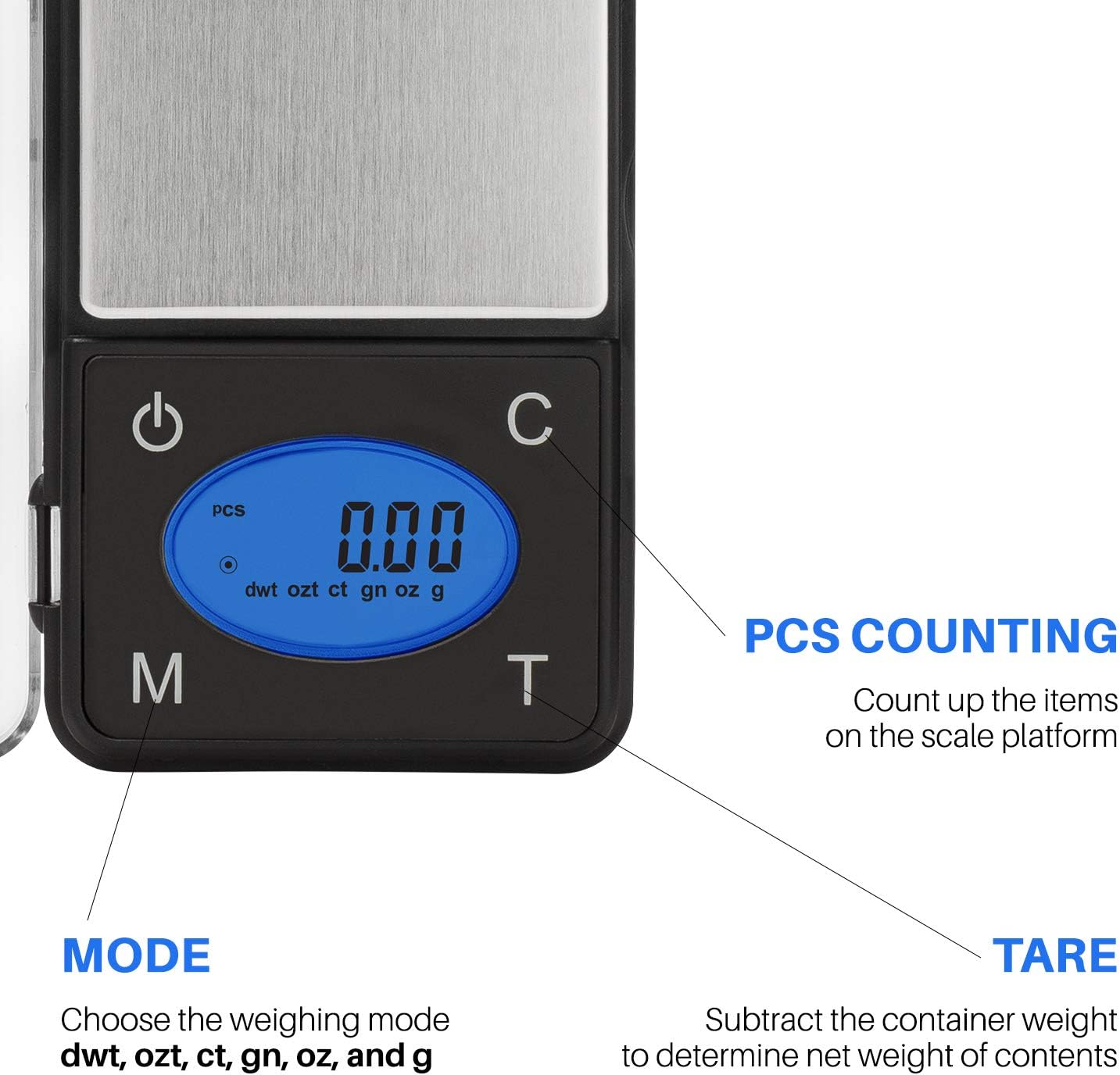 MODES: Features six separate weight modes for easy weight translations: g / oz / ozt / dwt / gn / ct, and a TARE mode for net determinations. Exclusive function of smart count PCS enables item counting.