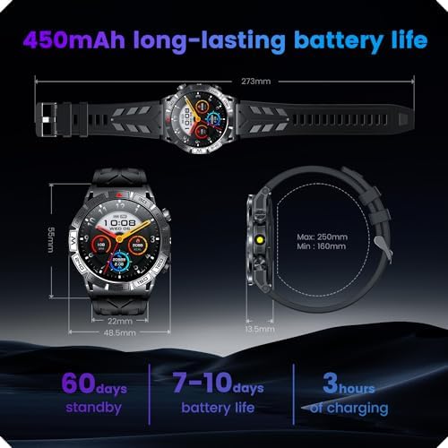The smart watch comes with compass, barometer and flashlight function. The flashlight feature on the side of the smartwatch provides convenient emergency lighting in low-light environments.High-capacity battery: The smart watch with 450mAh high-capacity battery that lasts for 7-10 days and has a standby time of about 60 days.