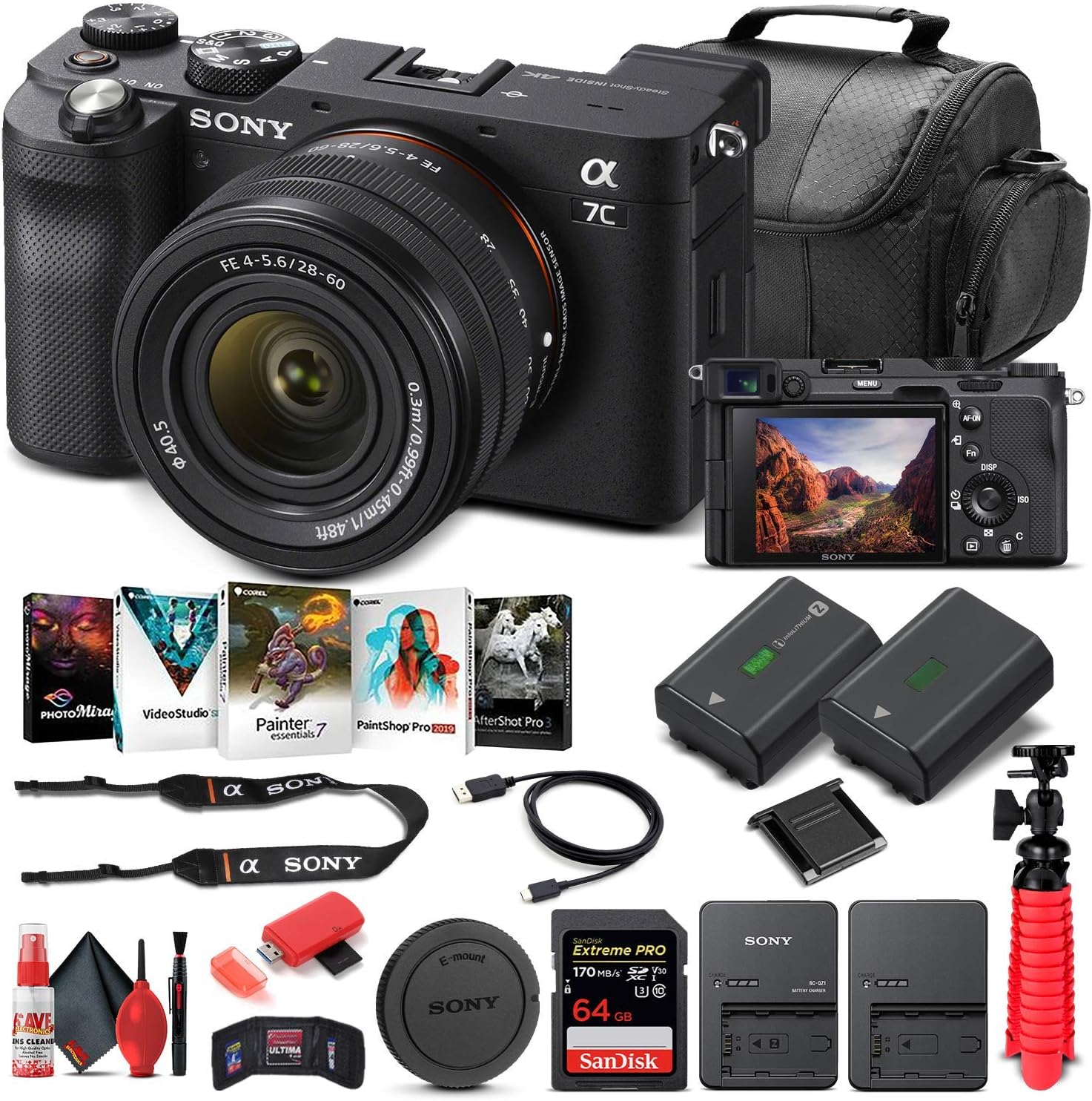 Bundle Includes: 1 x Sony Alpha a7C Mirrorless Digital Camera with 28-60mm Lens (Black), 1 x 64GB Memory Card, 1 x NP-FZ100 Rechargeable Lithium-Ion Battery, 1 x Corel Photo Software With PhotoMirage, AfterShot, Painter Essentials, PaintShop Pro, and Video Studio, 1 x Large Padded Case, 1 x NP-FZ100 charger, 1 x Memory Card Reader, 1 x Deluxe Cleaning Set, 1 x 12 Inch Flexible Tripod, 1 x Memory Card Wallet