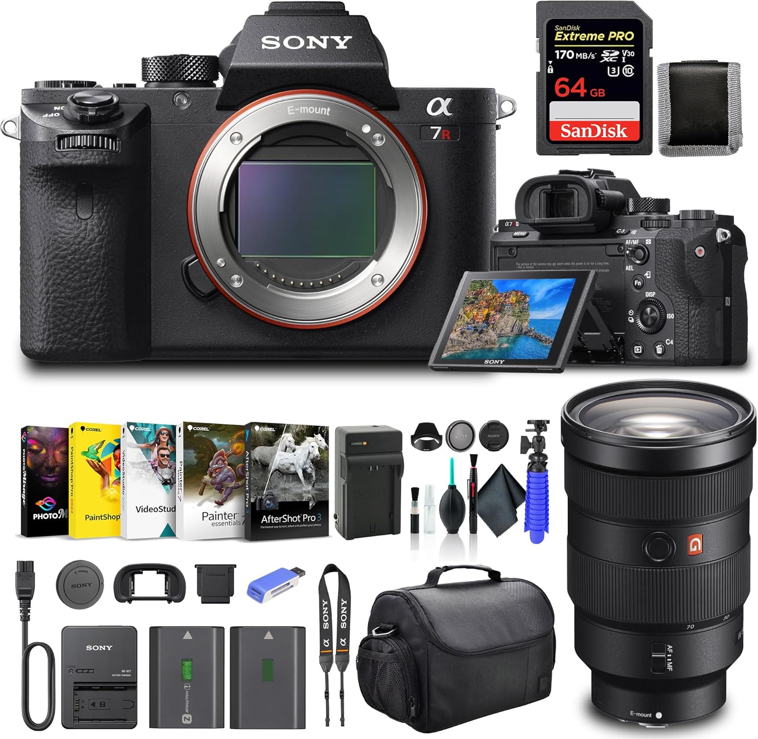 SONY USA Authorized Model Includes Full USA SONY Warranty. Bundle Includes: 1 – Sony Alpha a7R II Mirrorless Digital Camera (Body Only), 1 – Sony FE 24-70mm f/2.8 GM Lens, 1 – SecureDigital 64GB Extreme PRO Memory Card, 1 – Corel Photo Software, 1 – Large Padded Case, 1 – NPF-W50 Charger, 1 – NPF-W50 Battery, 1 – Memory Card Reader, 1 – Cleaning Set, 1 – 12 Inch Flexible Tripod, 1 – Memory Card Wallet