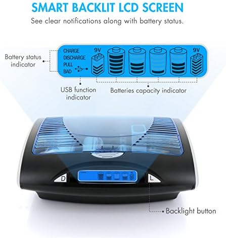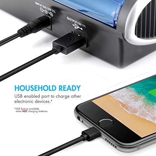 Home applications – T9688 functions as the most comprehensive universal household battery charger. A built-in USB port (output: 5V DC 500mA) on the back side of the charger can power portable electronic devices for added convenience. Includes 1 year warranty.