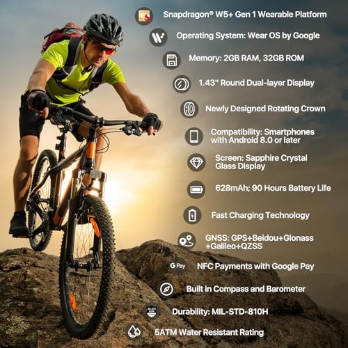 【Flagship Model, Upgraded Premium Design】Featuring a stylish and functional 1.43-inch OLED screen (466*466 high-resolution) with auto-adjustable brightness and Sapphire Crystal Glass. The interchangeable 24mm strap is made of durable and sweat-proof Fluororubber material. New reinforced bezel carvings ensure durability in any environment, with US Military Standard 810H certification. Customize the dual display with colorful backlight and choose from over 7,000 watch face designs through the TimeShow app. Personalize your style and enhance your journey with this durable and stylish smartwatch.