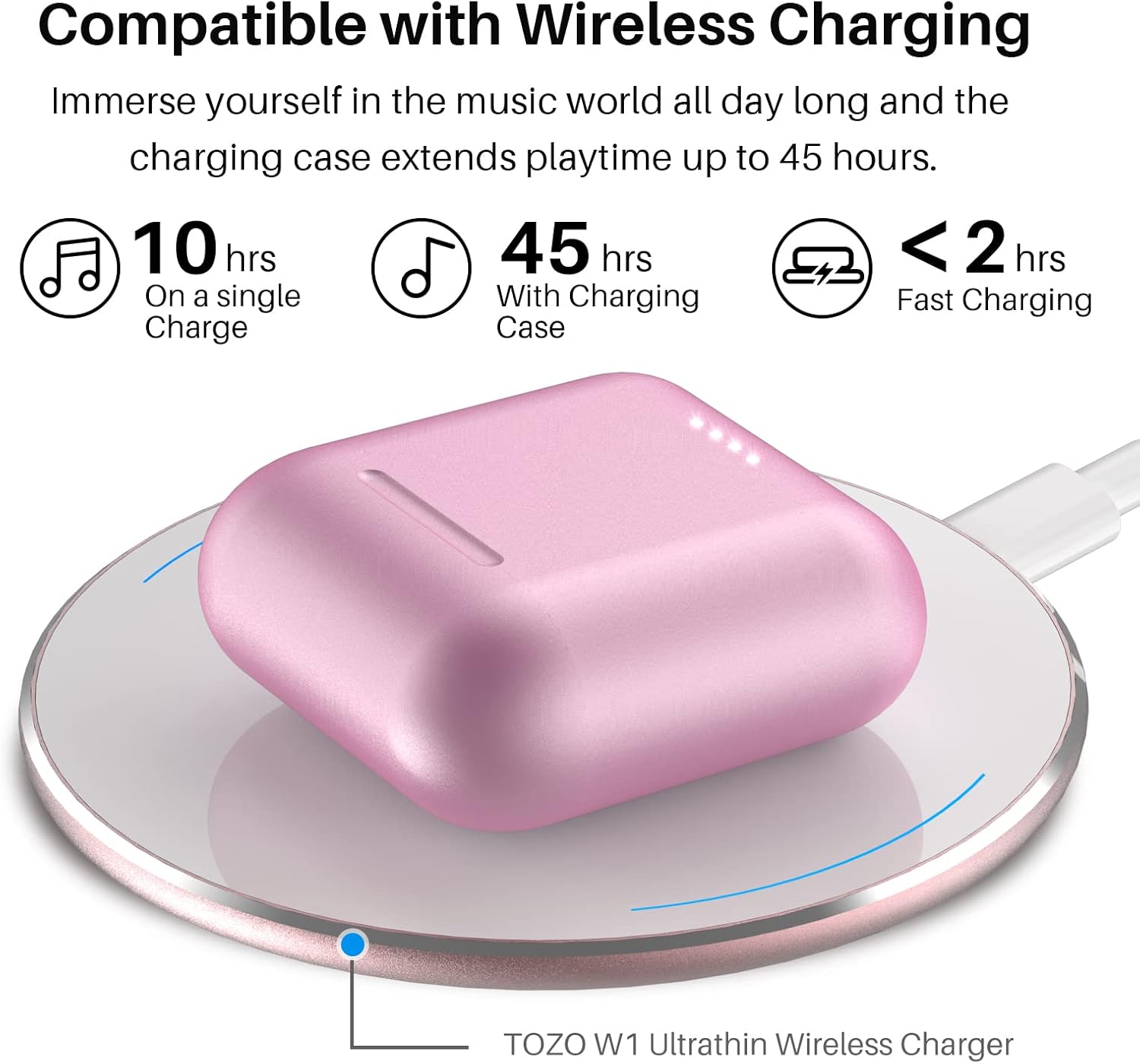 [45Hrs Playtime Endurance] Playtime lasts for over 10 hours from single charge and total 45 hours with charging case, which can listen to up to 675 songs or dive into 10,800 short videos. Enjoy fast charging, to fully charge the rechargerable case only 55 minutes via USB-A to Micro USB charging cable or less than 2 hours via wireless charger. Providing convenient charging way with no strings attached.