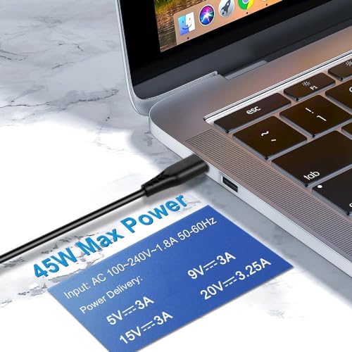 Input:100-240V~1.6A. Output: 5V-3A or 9V-3A or 15V-3A or 20V-3.25A Watts: 65W. Connecter Size: USB-C Tip /tyep C port.