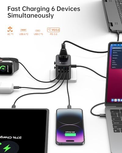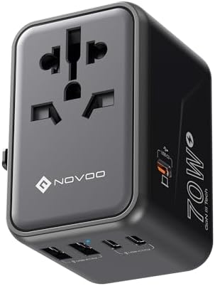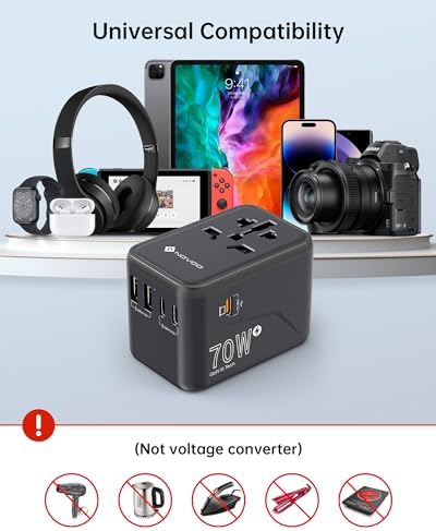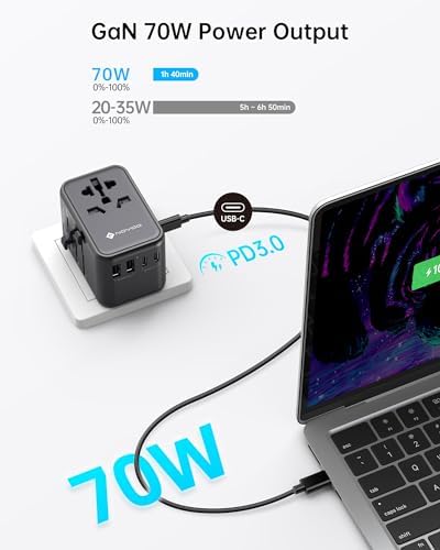 ✈【70W USB C Universal Power Adapter】Single 1 USB C ports can charge up to 70W. The 1 USB A ports and 1 USB C ports can charge up to 60W, 2 types of USB ports can detect charged devices, providing your worldwide journey more charging options; ideal for cellphone, tablet, earphone, camera, laptop, etc.