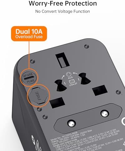 ✈【Safety Protection】Universal power adapter has built-in 10A fuse to effectively prevent overcharging and short circuit, with FCC, CE and RoHS certified safety system, adjust the correct current output and automatically boost the charging speed, the port automatically adapts to the output of each device, our built-in safety shutter will also protect your electronics from harm.