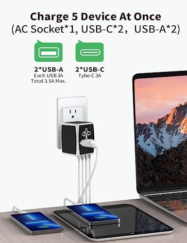 5 in 1 International Power Adapter: The adapter provides a universal AC outlet and 4 USB charging ports, max capacity up to 1920 watt (max 240 Volt, 8 A), can charger up to 5 devices Simultaneously; This adapters for europe is suitable for hotel, bedroom, and college dorm room