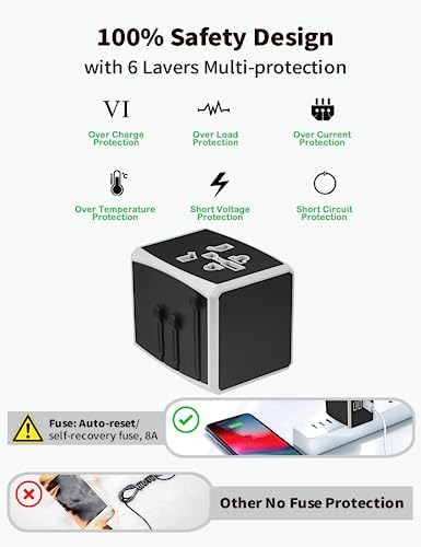 Safety is Most important – This travel adapter worldwide has patented Design of Built-in recovery fuse to ensure higher Safety – When the wire is short-circuit or overload, this travel adapter will automatic power off to limit and protect the circuit. A few minutes later, the auto- recovery fuse cools down and can work normally again. Relying on this recovery fuse it’ll cut off power when it detects getting too hot, which would avoid your devices from accidents