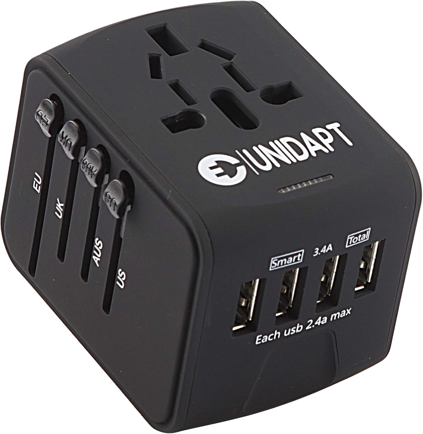 TRAVEL ESSENTIAL: Use Unidapts small international portable adapter and be sure that wherever you travel, you can keep your devices fully charged! Intelligent charge “IC” Allows it to automatically recognize devices and delivers the best electric current for everything you plug in, for optimized charging time of all of your devices.