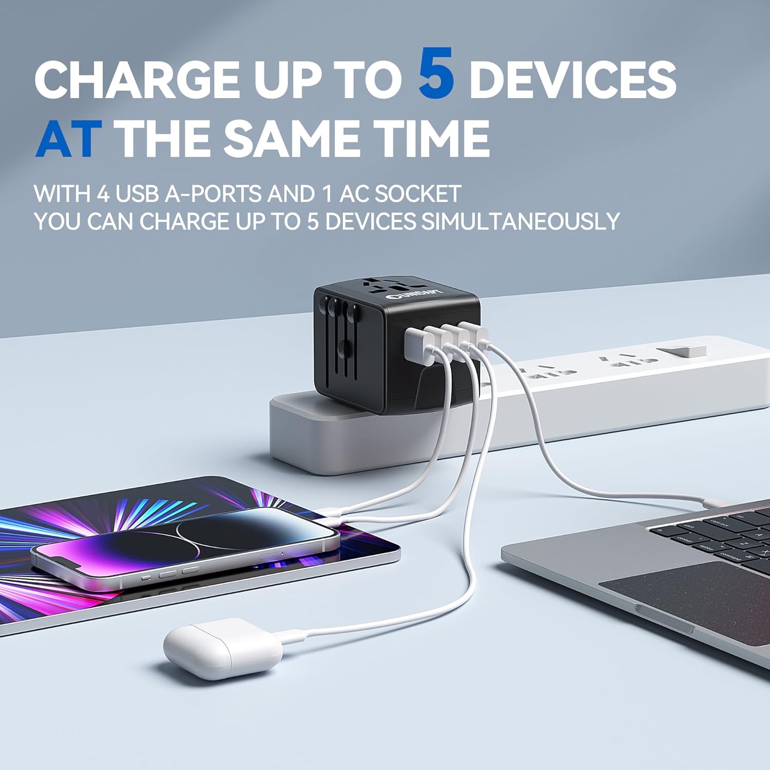 CHARGE UP TO 5 DEVICES: The Unidapt Travel Adaptor allows SIMULTANEOUS use of the AC power Socket and Four USB CHARGING Ports. It is compatible with devices such as: Laptops, bluetooth speakers, head phones, power banks, phones, tablets and so on.