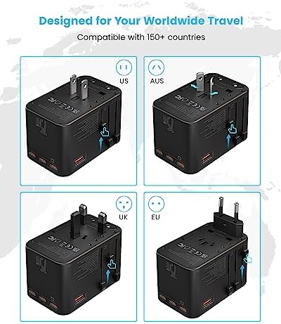 Travel Adapter Worldwide: The travel power adapter fit for more than150 countries. Type C Plug: Most of Europe, France, Germany, Italy, Spain, Iceland, Greece, Israel, Korea; Type G plug: UK, Malaysia, Hongkong, Dubai; Type A Plug: America, Canada, Mexico, Thailand, Japan, Taiwan, China(Mainland); Type I plug: Australia, New Zealand, Argentina and more. So it is perfect for your worldwide travel.