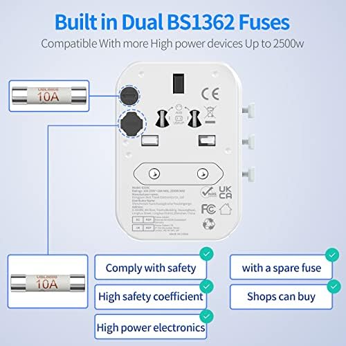 Multiple Security Design: Built in dual 10A BS1362 fuses , supports more safety for the large power devices. Built-in full copper part works more smoothly. Built-in safety installation provides children protection. Built-in strong internal hardware prevent electrocute. Built-in smart IC chip, surge protection ensures full protection for you and your equipment.