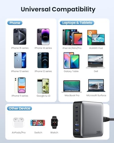 ![USB C Charger Block 200W, [2024 Upgraded] GaN III 6 Port Fast Charging Station Hub, PD 65W USB C Laptop Charger Compatible with MacBook Pro/Air,iPad,iPhone 15/14,Galaxy S23/S24 Steam Deck Dell XPS etc - Image 4](https://travelzoneuk.com/wp-content/uploads/2024/06/41hIBg5O5sL._AC_.jpg)