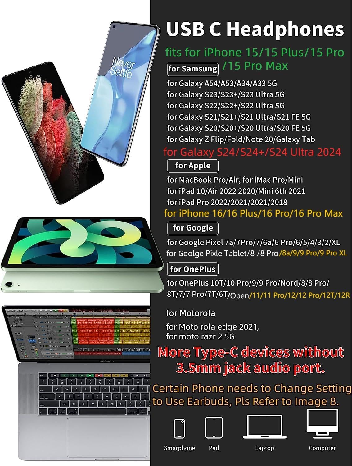USB C Headphones with Microphone for iPhone 16,16 Pro,16 Plus,16 Pro Max,15,15 Plus,15 Pro,15 Pro Max,for Samsung S24,S24+,S24 Ultra,for Google Pixel 9 Pro XL 8a 8 7a 76a 6 5 4,for Samsung Galaxy Z Flip,Fold,S23 FE,S23,S23+,S23 Ultra,A53,A54,A33,A34,S22,S22+,S22 Ultra,S21 FE,S21,S21+,S21 Ultra,S20 FE,S20 Ultra,S20+,S20,Tab S9,S9+,S9 Ultra,S8,S7,for OnePlus 10T,10 Pro,9,Nord,8T,8,for Macbook Pro,for iPad 10,iPad Pro,Mini 6,Air 4 5 6,for motorola,for Nothing Phone,USB-C device without 3.5mm jack