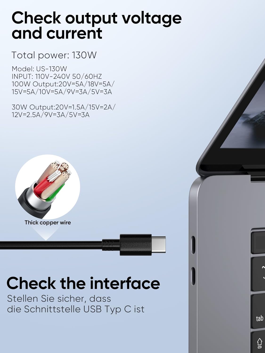 Multiple Power Outputs:The Universal 100W USB C Charger will automatically and intelligently recognize your device. Its charging power is up to 96W/87W/67W/65W/61W/45W/30/15W, please compare with your original laptop or tablet charger