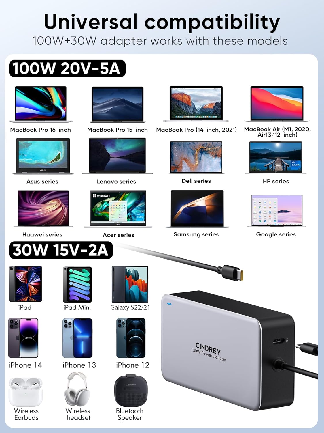 CINDREY Professional-Grade Universal100W USB-C/ Type C Laptop Charger