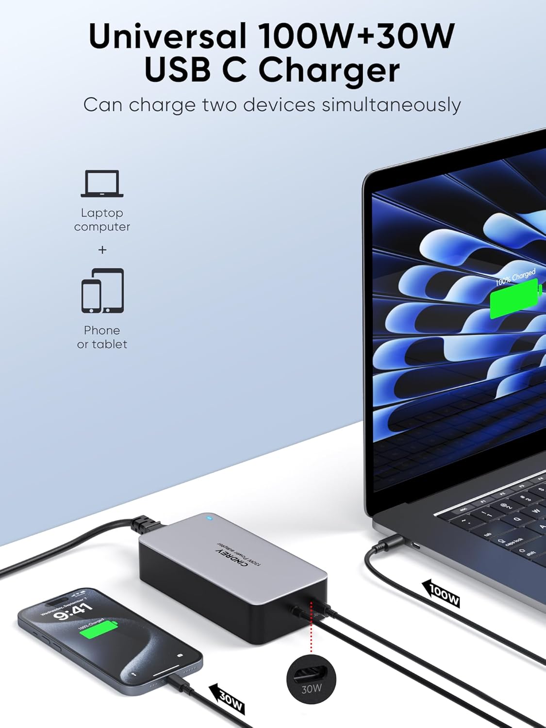 Multipurpose: Our 100W USB C Laptop Charger with an additional 30W USB-C port can charge up to 2 devices at once, from cell phones to tablets and laptops. The more ports, the more powerful it is, making it ideal for travel, home or office