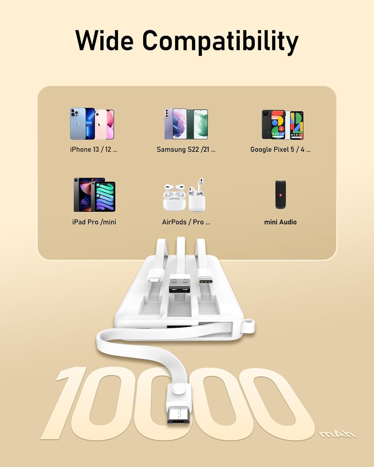 [Battery Bank with Built in Cables] Battery bank has built in USB Micro, USB C, and iPhone cables compatible with iPhone 14/13/12/11/XR/8/7, iPad, and Samsung Galaxy S20/S21/S22/S23, Tablet, and other android devices. The built in USB A input cable for recharge the power bank itself. No need to take any charging cables, perfect battery pack for travel